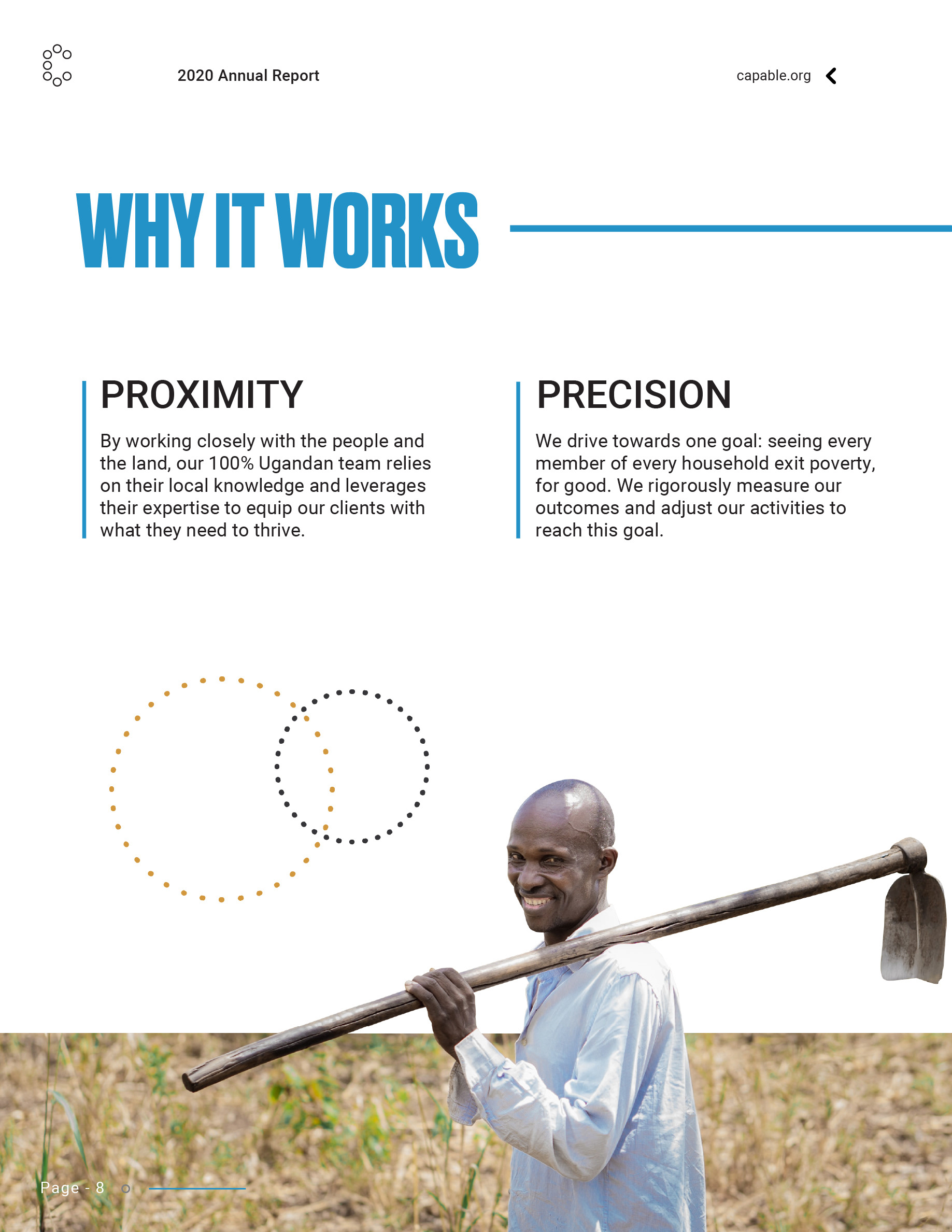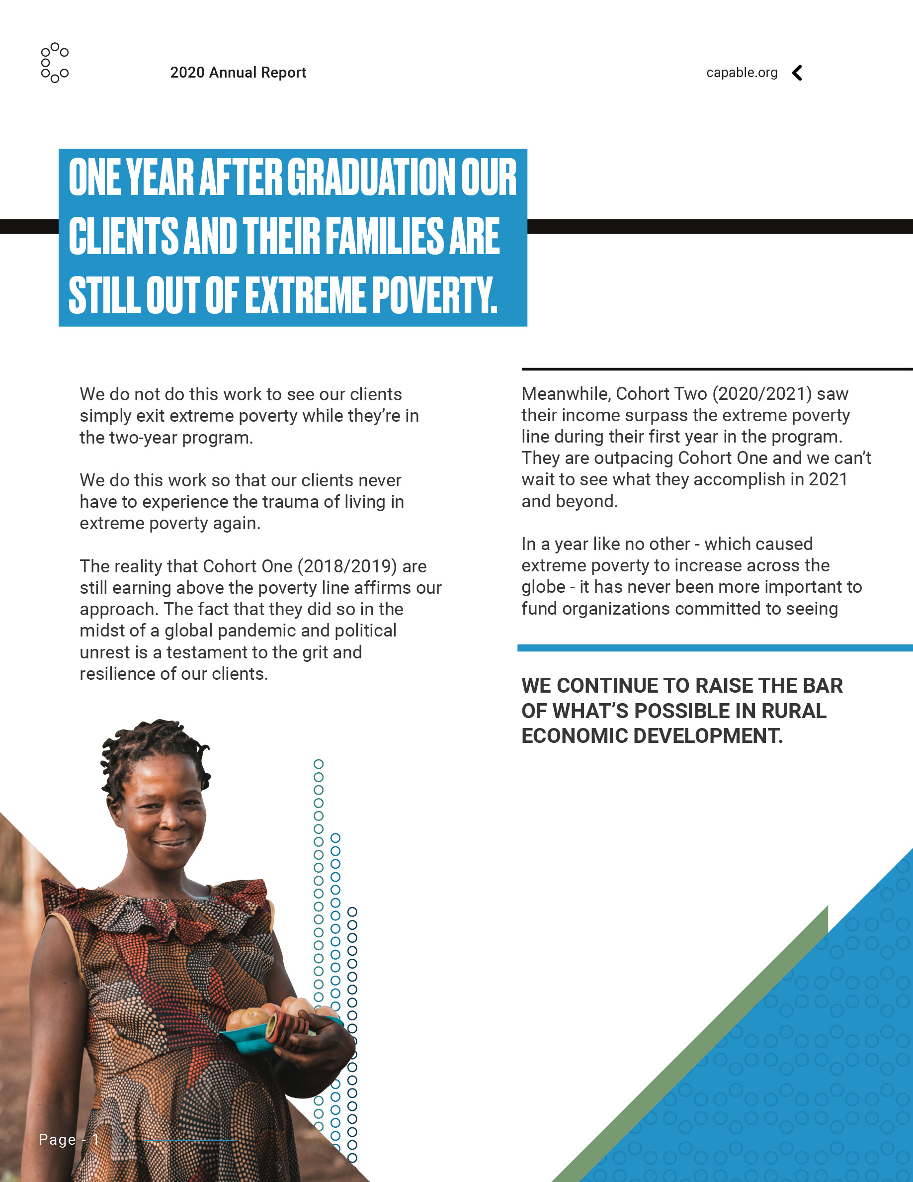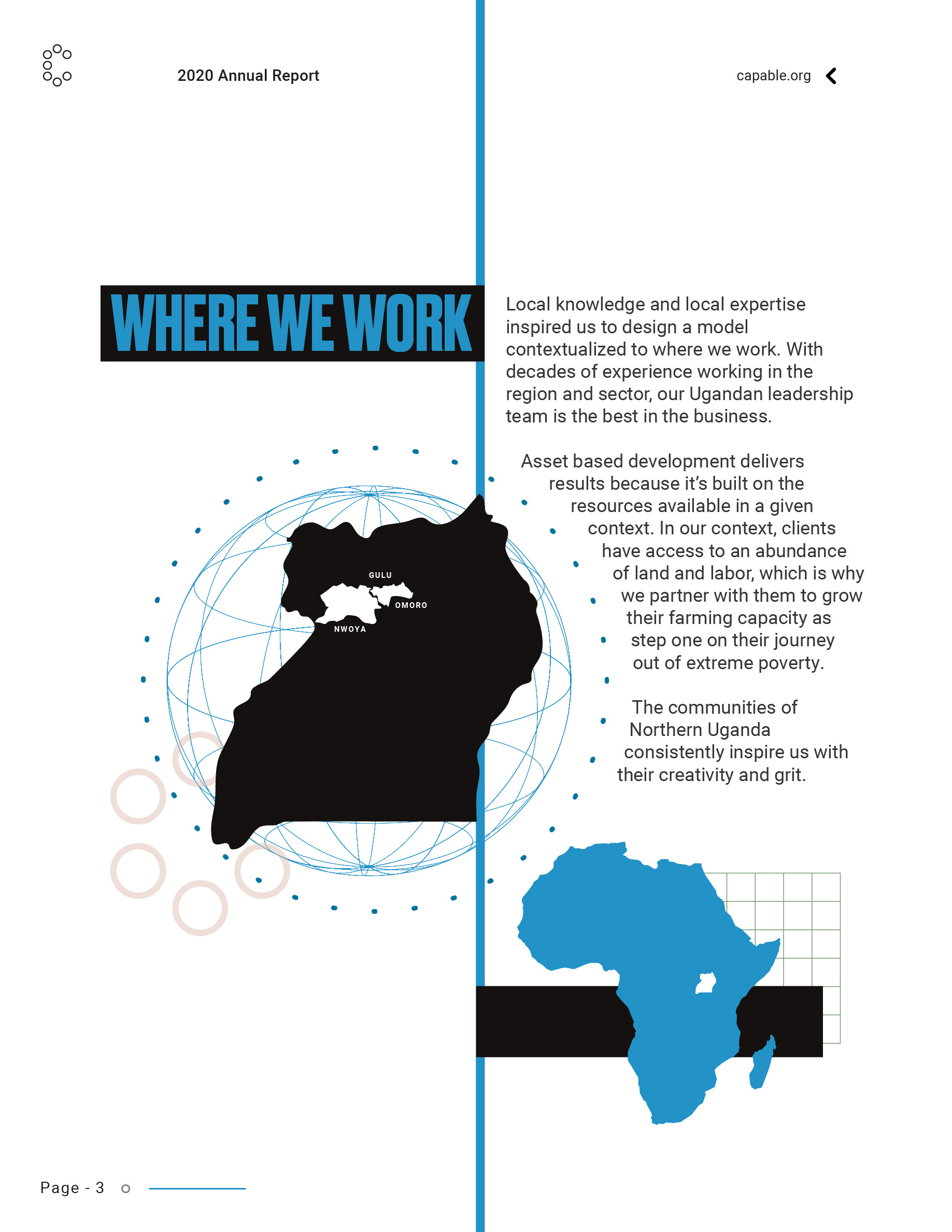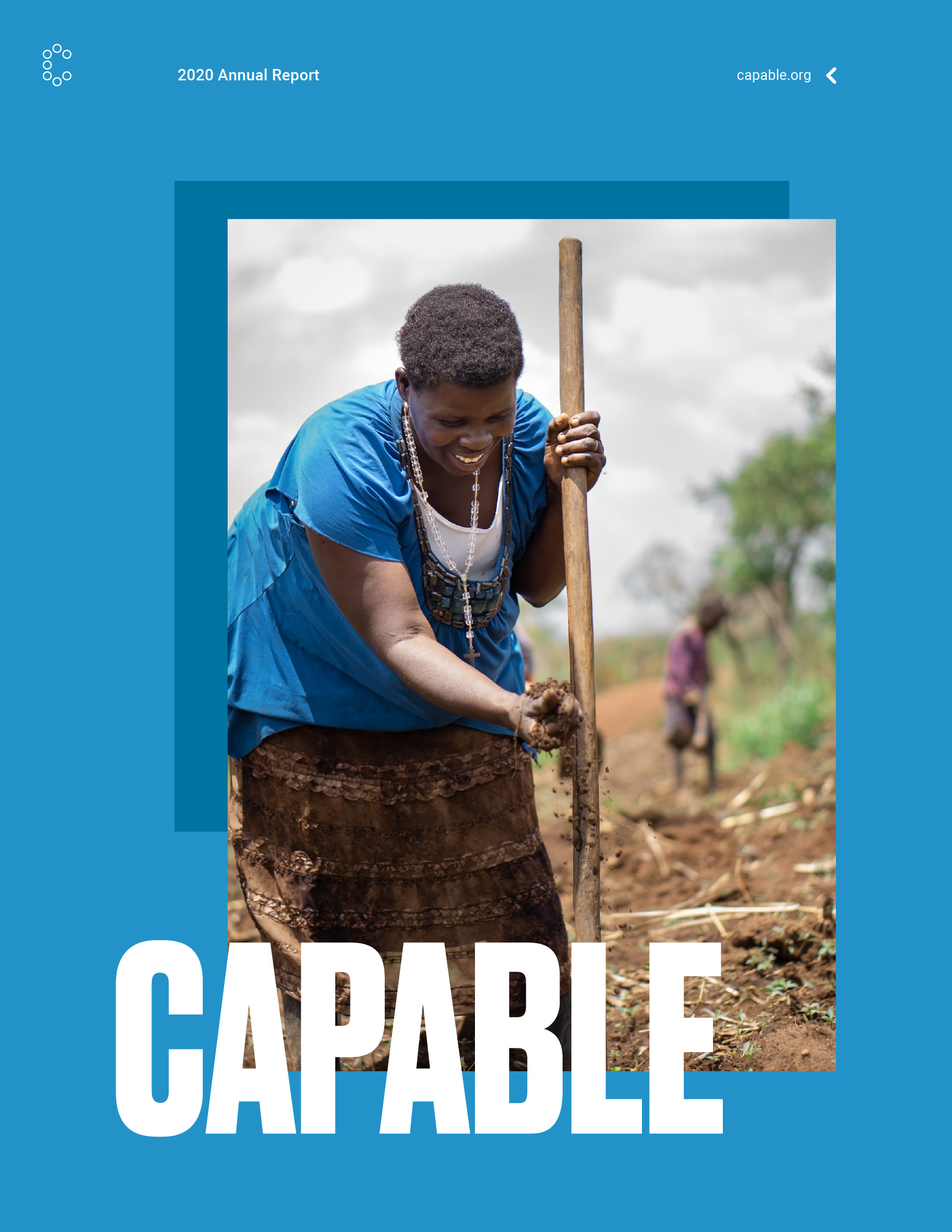 In collaboration with Legible — a brand strategy and identity firm — I had the opportunity to work with Capable. Capable is a non-profit seeking to eradicate poverty in Northern Uganda. They do this through a Ugandan team who teach and advise cohorts over a two year program. This leads to long-lasting results as participants in the program come out equipped with the skills and knowledge to stay above the poverty line. Capable was in need of an annual report. The goals for this report were to lean into their secondary color of blue, use bold titles, and to really display the sustained successes of graduates even after completion of the program. You can look through the entire annual report here.