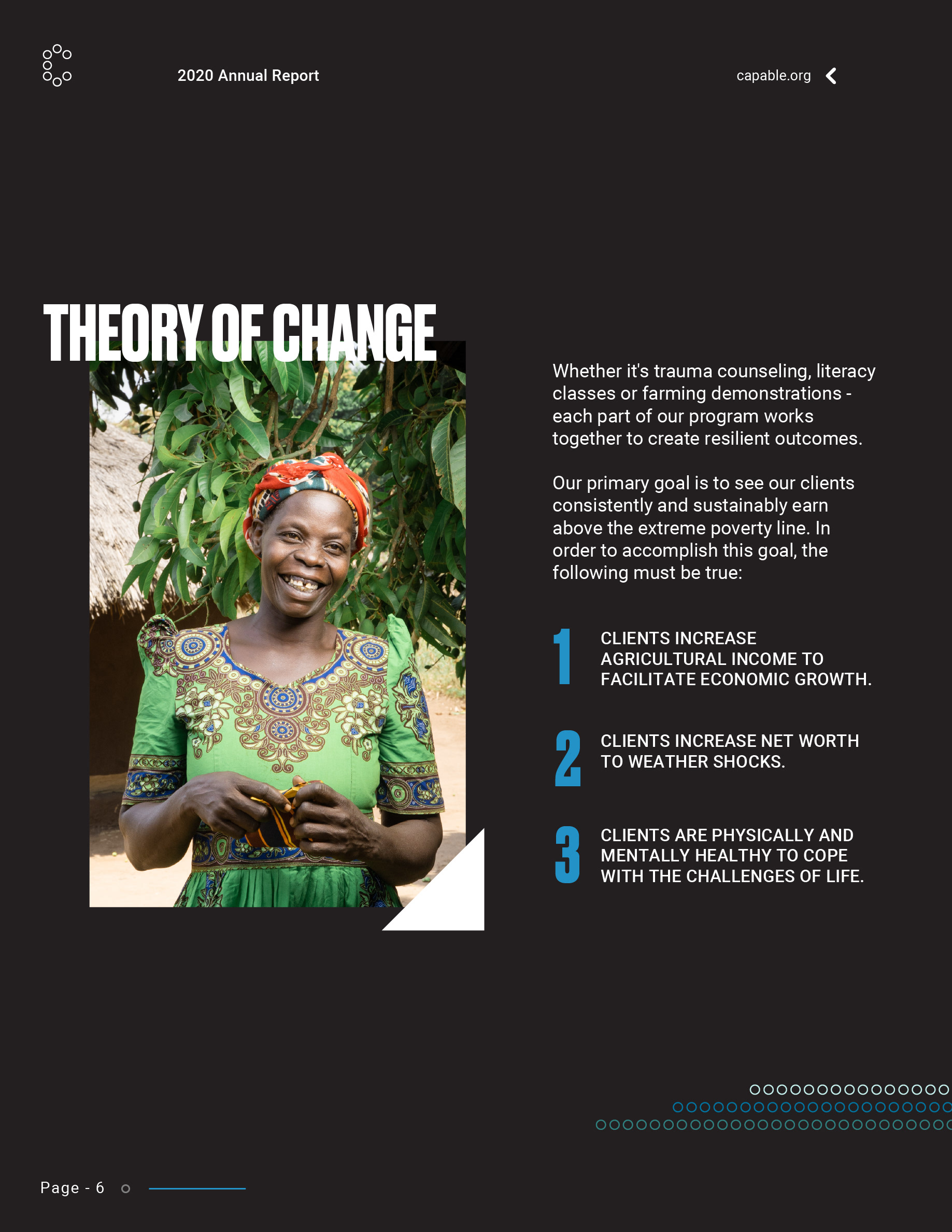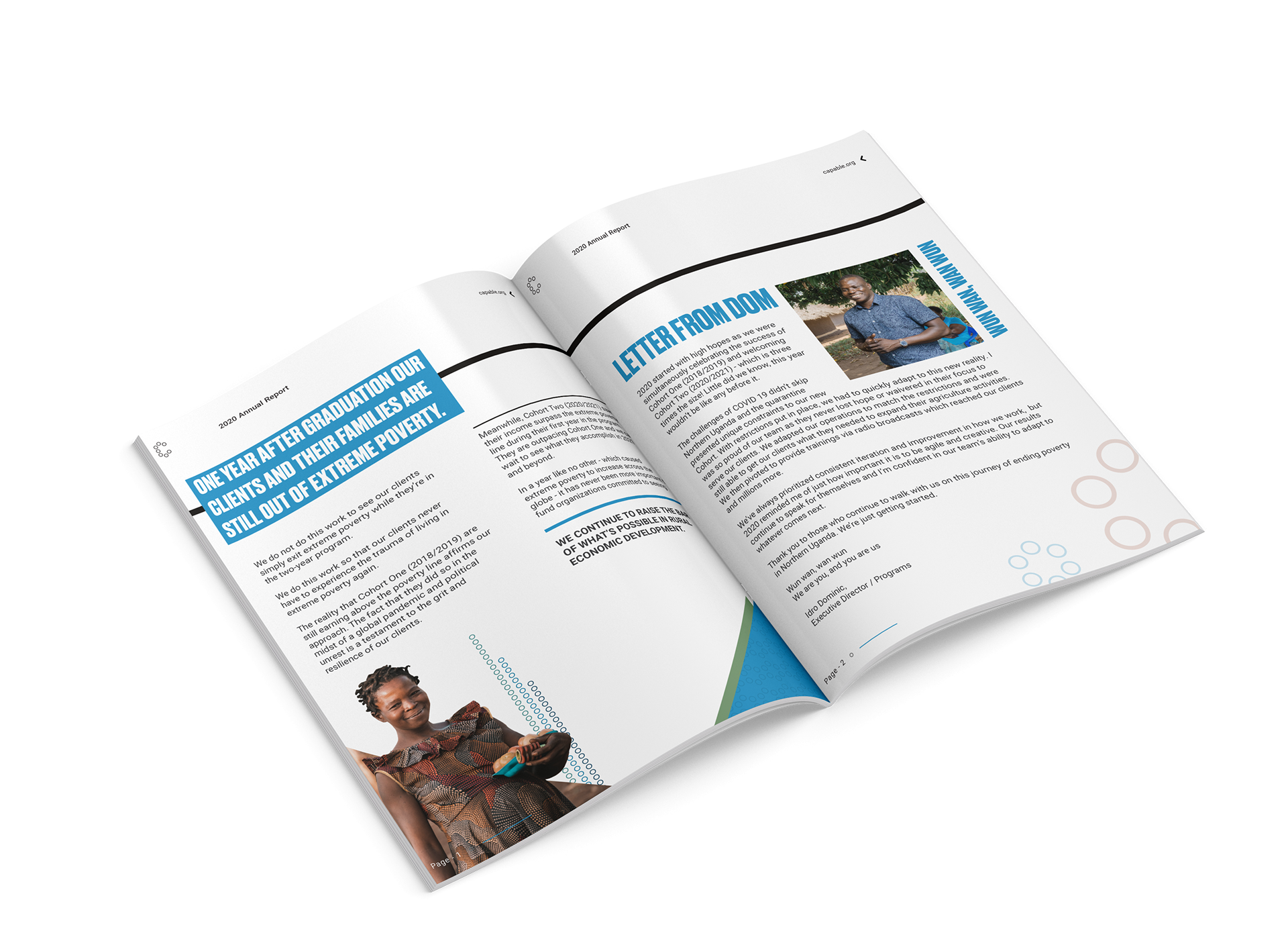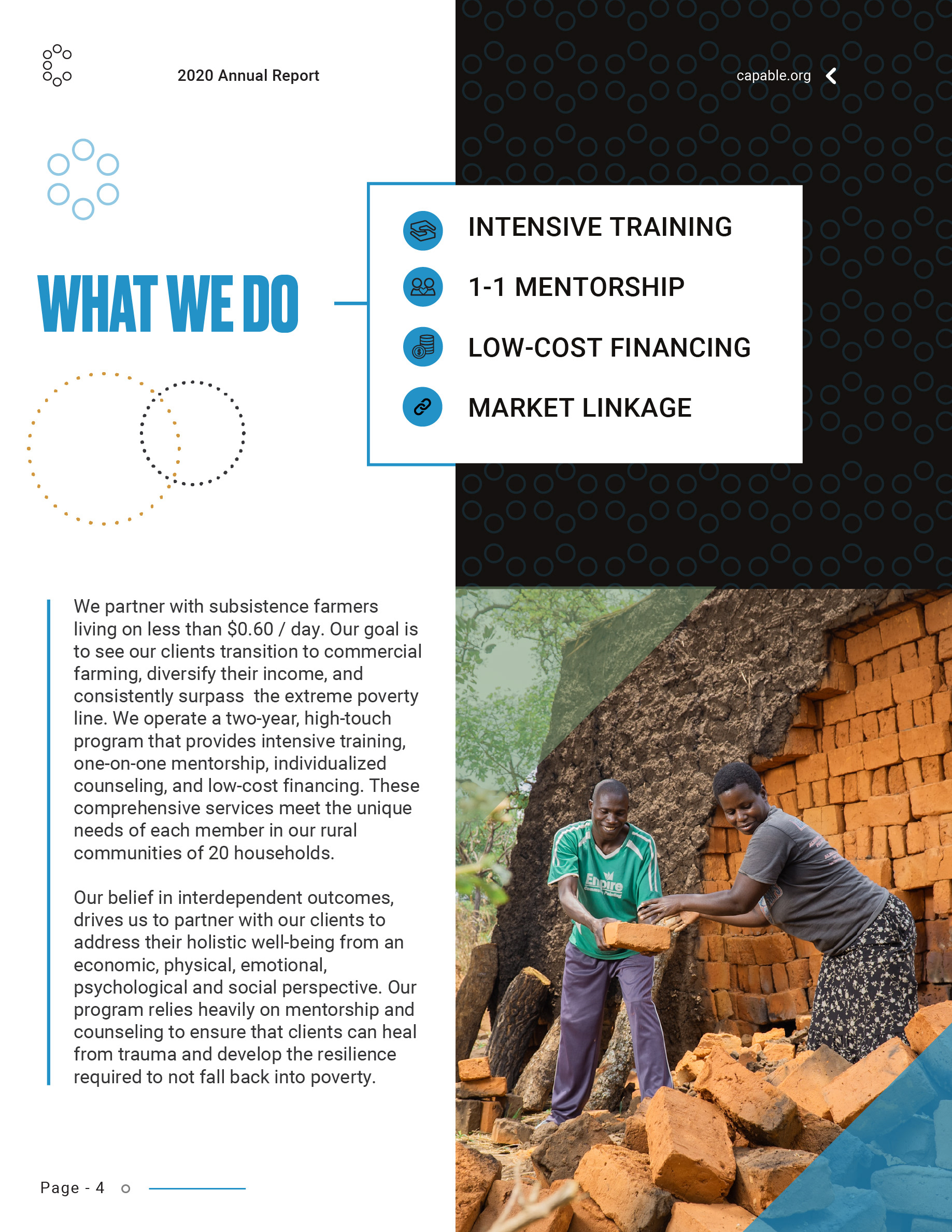 In collaboration with Legible — a brand strategy and identity firm — I had the opportunity to work with Capable. Capable is a non-profit seeking to eradicate poverty in Northern Uganda. They do this through a Ugandan team who teach and advise cohorts over a two year program. This leads to long-lasting results as participants in the program come out equipped with the skills and knowledge to stay above the poverty line. Capable was in need of an annual report. The goals for this report were to lean into their secondary color of blue, use bold titles, and to really display the sustained successes of graduates even after completion of the program. You can look through the entire annual report here.