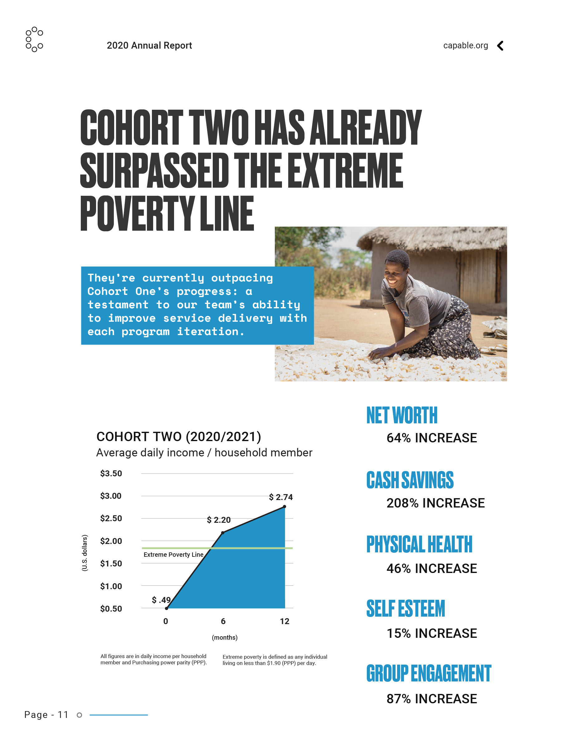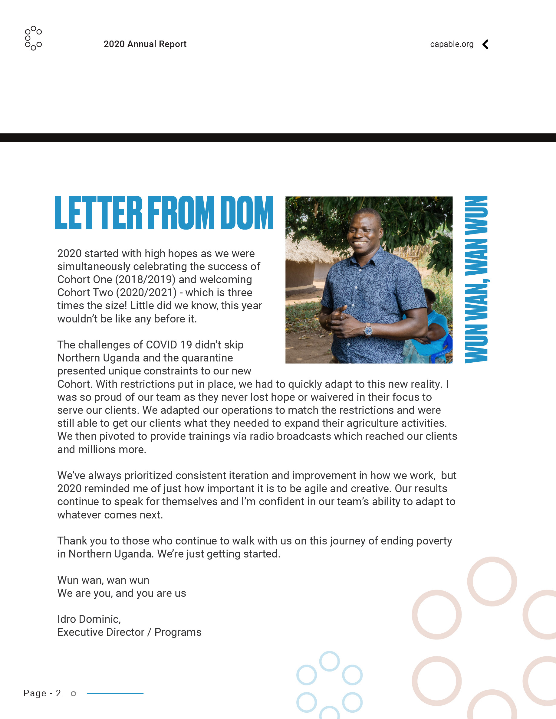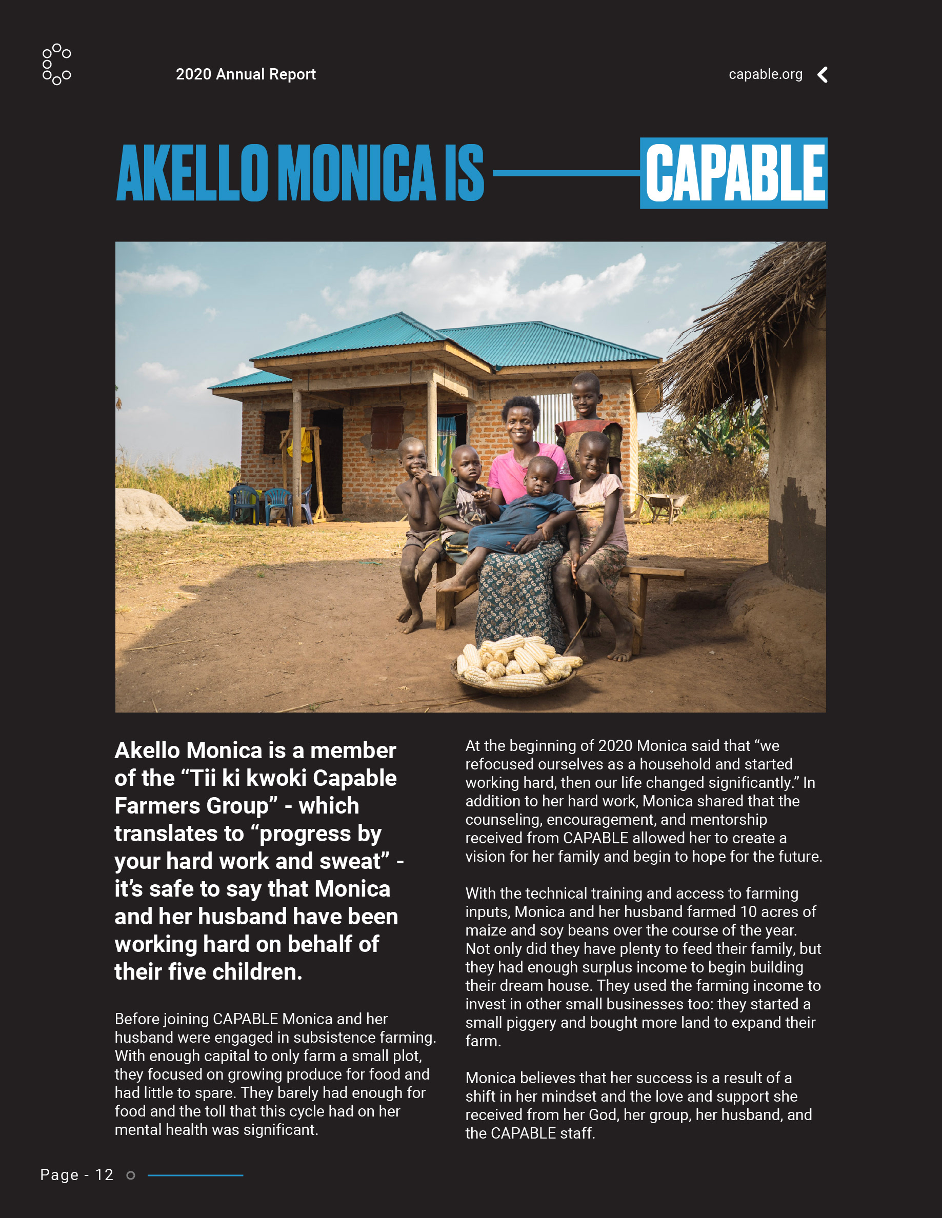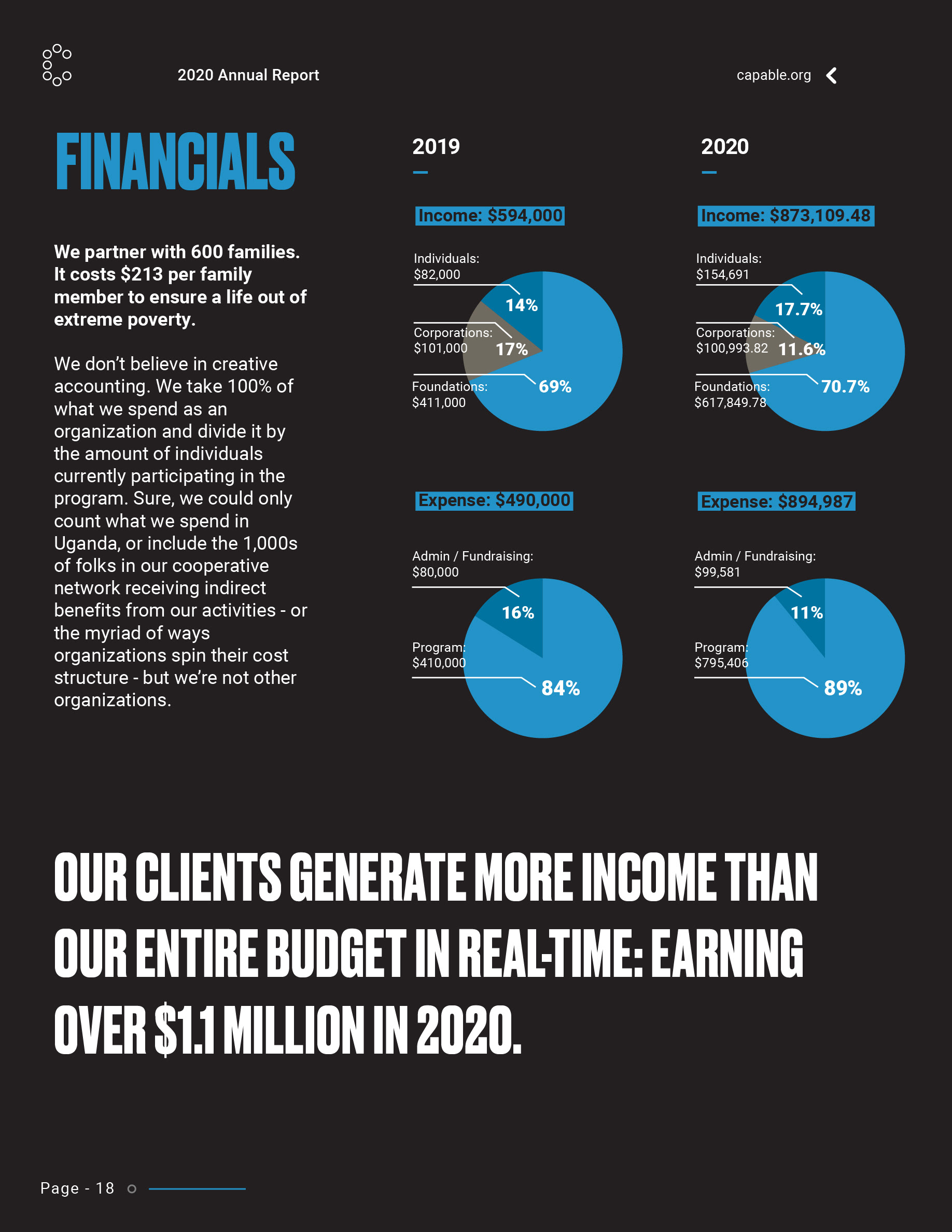 In collaboration with Legible — a brand strategy and identity firm — I had the opportunity to work with Capable. Capable is a non-profit seeking to eradicate poverty in Northern Uganda. They do this through a Ugandan team who teach and advise cohorts over a two year program. This leads to long-lasting results as participants in the program come out equipped with the skills and knowledge to stay above the poverty line. Capable was in need of an annual report. The goals for this report were to lean into their secondary color of blue, use bold titles, and to really display the sustained successes of graduates even after completion of the program. You can look through the entire annual report here.